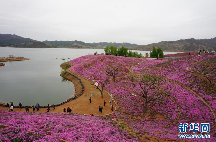 4月24日,游人在雨花谷景区游览。近日,河北省迁西县雨花谷景区的芝樱花盛开,吸引游客前来观赏。