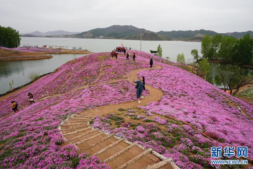 4月24日,游人在雨花谷景区游览。近日,河北省迁西县雨花谷景区的芝樱花盛开,吸引游客前来观赏。