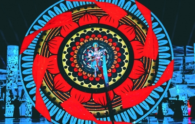 舞蹈演员化作“飞天”,以这个巨大圆盘为背景,悬吊在空中翩翩起舞。本报记者 潘之望摄