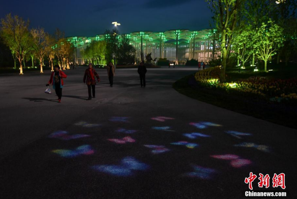 4月29日,2019年中国北京世界园艺博览会正式对公众开放。晚间,世园会园内亮起彩蝶灯光妆点园区步道。中新社记者 崔楠 摄