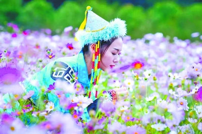 游客穿着蒙古服装在木兰草原的格桑花海拍照 景区供图