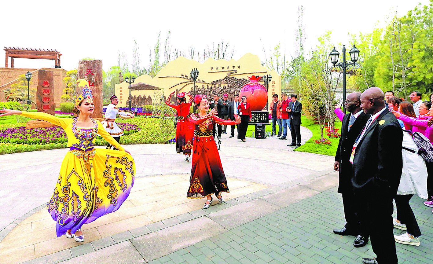 4月29日,2019年中国北京世界园艺博览会在北京市延庆区开园。图为中外嘉宾、游客在新疆室外展园观看歌舞表演。本报记者宋君摄