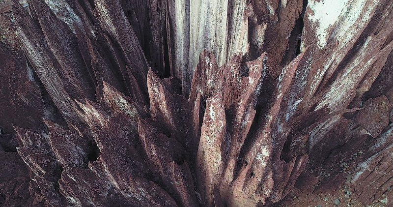岩盐天坑南北长约150米、东西宽60米、深50米。尖锐挺拔的盐石林似一把把利剑倒插坑底,剑刃指向天空,给人强烈的视觉震撼。