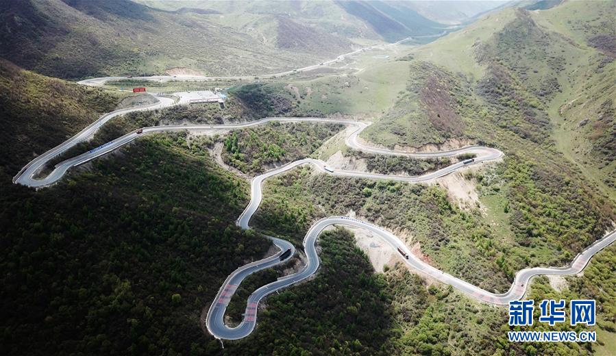 车辆行驶在分水岭国道212线上(5月21日无人机拍摄)。 海拔2980米的分水岭位于甘肃省定西市漳县和渭源县交界处,是黄河两大支流渭河水系和洮河水系的界岭,被当地人称为“山路十八弯”的国道212线蜿蜒其中,沿途景色怡人。 新华社记者 陈斌 摄