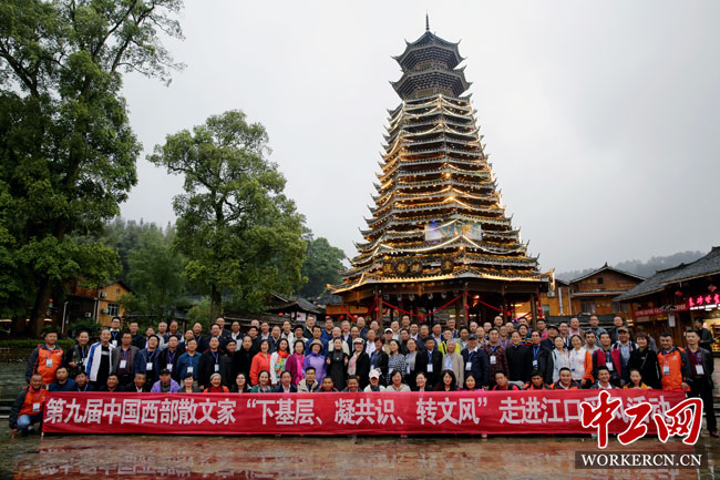 我与先期抵达江口县的河北、山东两位散文家在江口县文联副秘书长吴秀发先生的陪同下,抢先游览了铜仁和江口县的几个景点与苗族侗族村落。他如导游一般,滔滔不绝地向我们讲解了许多江口的文脉和民风习俗。刚到江口的当晚,他请我们下馆子做客,献上取水于茅台镇、用江口当地拐枣和龙爪浸泡的“鸡拐子”酒。那一晚,我们兴致很高,谈天说地,咝咝地呷着酒,微醺醺后方回宾馆。老吴为人敦厚、热情,从踏入和离开贵州,都是他驾着自己的小车,驮着我们四处奔跑的。他摄影技术不错,无论游山玩水还是论坛和采风,摄影机的镜头一直没离开过我们。有他的细心呵护,在贵州的五天日子里,让我这个不习惯飘零于异地的恋乡人,总算找到了一种宾至如归的温暖。