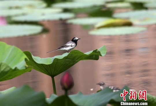 一只小鸟落在莲叶上休息。 罗兴仓 摄