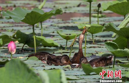 7月7日,新疆库尔勒市孔雀河畔成片的荷花竞相开放,引来无数游客和摄影爱好者驻足。抢镜的除了荷花外还有嬉戏于花间的野鸭、水鸟、鱼儿等。放眼望去,荷间水鸟们相映成趣,呈现出一幅城市与自然和谐相处的美好画面。