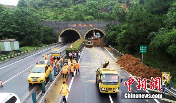 大广高速武吉段K2790+530公里处,河下隧道入口外山体发生塌方,塌方造成广州往黄石方向道路中断,养护应急所立即调集30多名抢险人员和16台机械设备赶赴现场开展抢险清理泥石流工作。文/沈君 姚雅君 图/钟小明