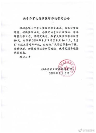 中新网8月6日电 据山西省晋中市祁县县委宣传部官方微博消息,祁县乔家大院旅游区管理处8月6日发布公告称,乔家大院景区暂停运营10天,时间从2019年8月7日至8月16日止,8月17日起正常对外开放。