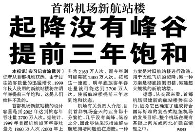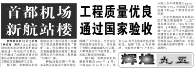 新落成的候机楼,建筑面积为6万平方米,比原候机楼大5倍,高峰小时旅客吞吐量为1500人次。(1979年10月2日《北京日报》1版,《崭新的航空港》)