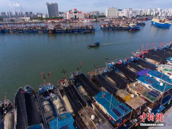 资料图为航拍海口新港码头众多船只回港避风。中新社记者 骆云飞 摄