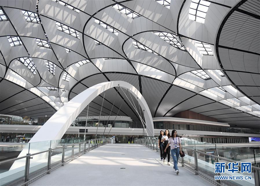 9月4日拍摄的北京大兴国际机场内部。 随着各项验收的完成,北京大兴国际机场投运在即。北京大兴国际机场是目前世界最大的综合交通枢纽,拥有全球首座高铁地下穿行的机场航站楼、全球首座双层出发双层到达的航站楼、世界最大单体航站楼。 新华社记者 张晨霖 摄