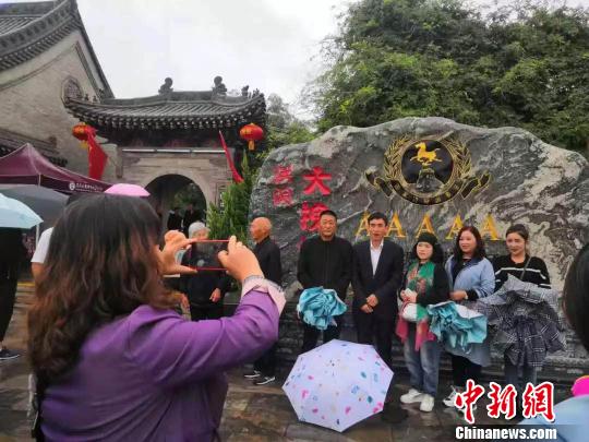 图为游客在洪洞大槐树景区门前合影。洪洞大槐树景区供图 摄