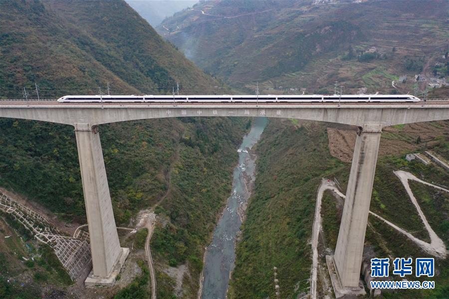 一辆成贵高铁测试列车驶过香坝河特大桥(12月3日无人机拍摄)。 成(都)贵(阳)高铁预计于12月16日全线正式开通运营。成贵高铁线路全长650公里,是我国“八纵八横”高速铁路网的重要组成部分,设计时速为250公里。 新华社记者 刘续 摄
