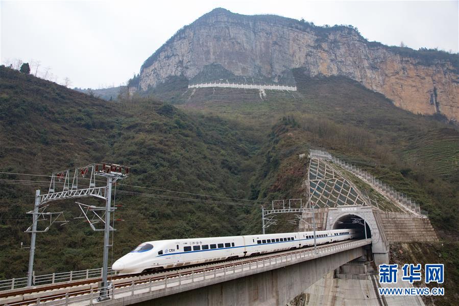 一辆成贵高铁测试列车在山间行驶(12月3日无人机拍摄)。 成(都)贵(阳)高铁预计于12月16日全线正式开通运营。成贵高铁线路全长650公里,是我国“八纵八横”高速铁路网的重要组成部分,设计时速为250公里。 新华社记者 刘续 摄