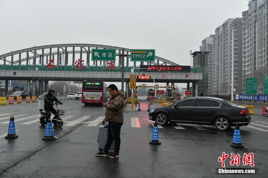 12月16日,河北石家庄裕华路一高速路入口因降雪关闭。据河北高速交警总队消息,因降雪,河北多条高速站口采取闭合管控措施。图为等待上道的车辆排起长龙。中新社记者 翟羽佳 摄