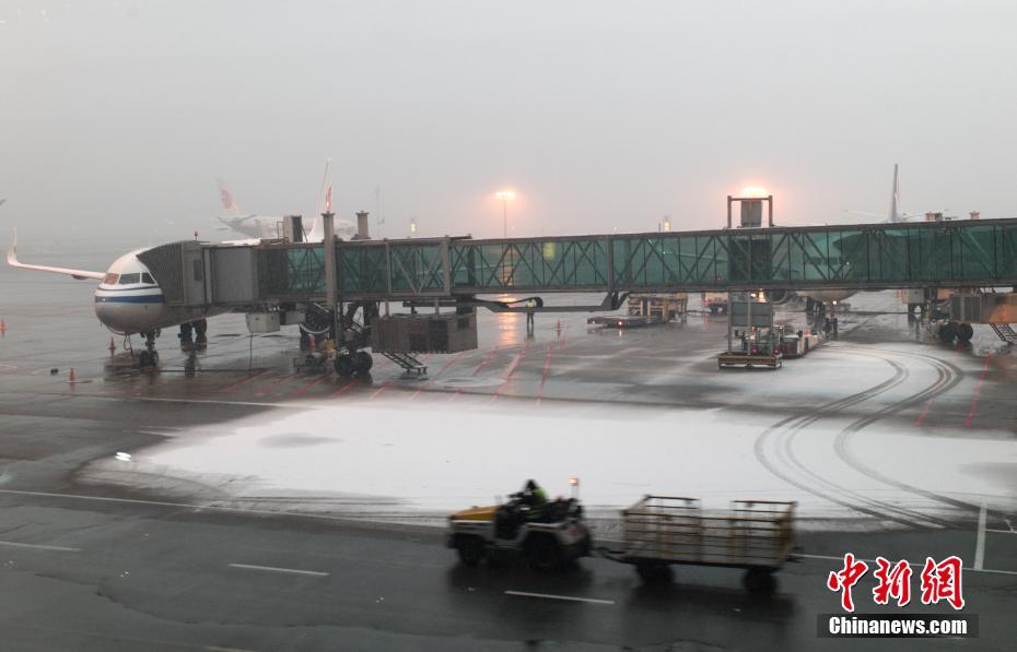 12月16日,北京迎来降雪天气。当日,首都机场计划起降航班1328架次,运送旅客近21.34万人次。截至7时,共执行航班149架次,取消42架次。图为雪中的首都机场。中新社记者 盛佳鹏 摄