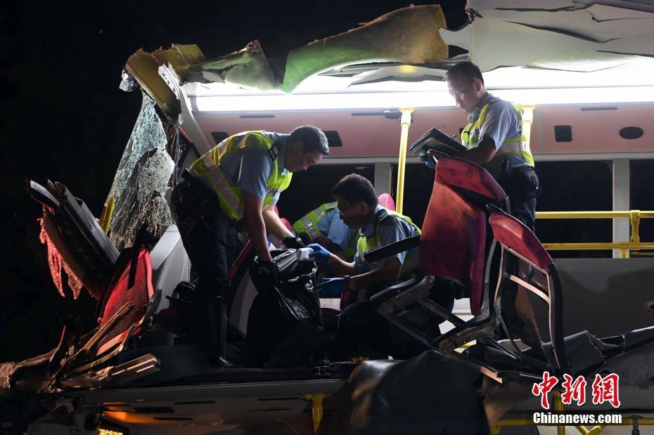 12月18日下午,香港粉岭公路近宝石湖路回旋处发生致命车祸,一辆九巴怀疑撞倒路旁一棵大树,一名伤者送院后不治,共造成6人死亡,包括3男3女。现场消息指,另有39人受伤,部分送往那打素、北区及博爱医院。图为事发现场警方和消防人员在进行善后工作。中新社记者 麦尚旻 摄