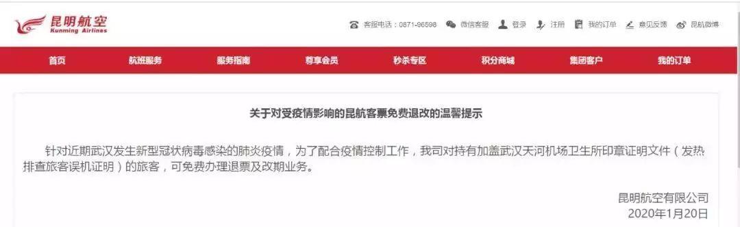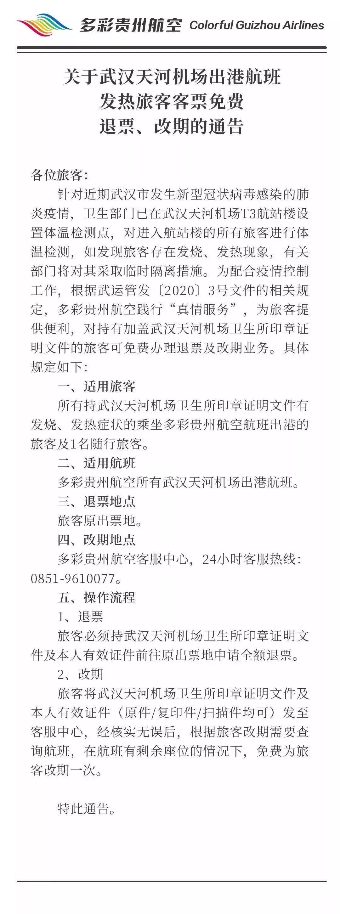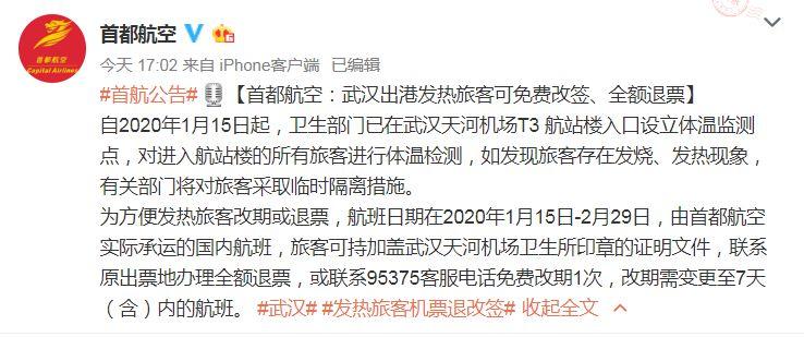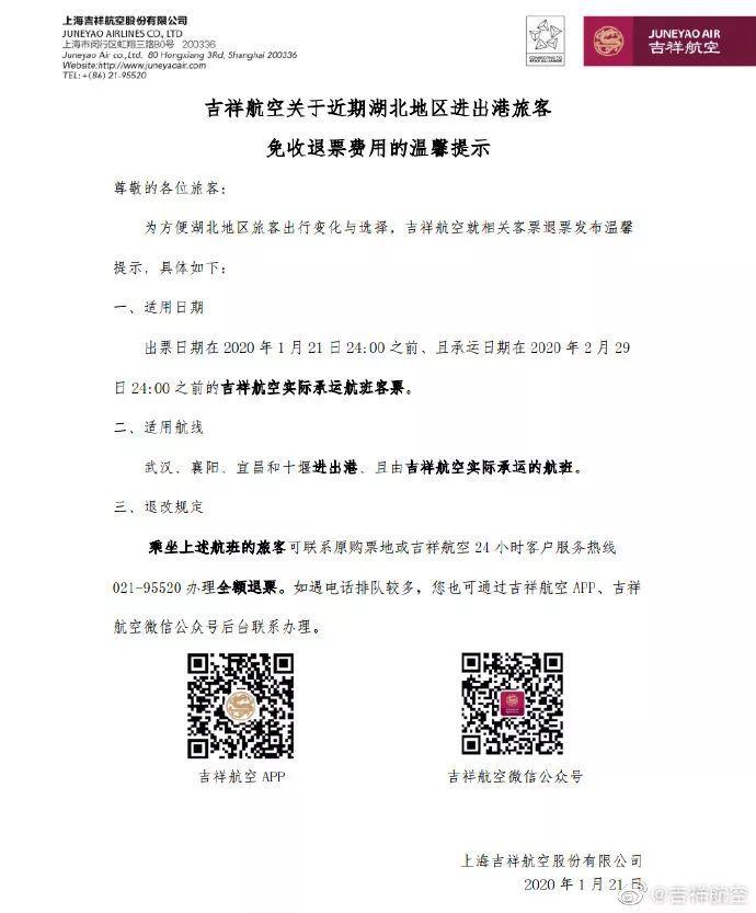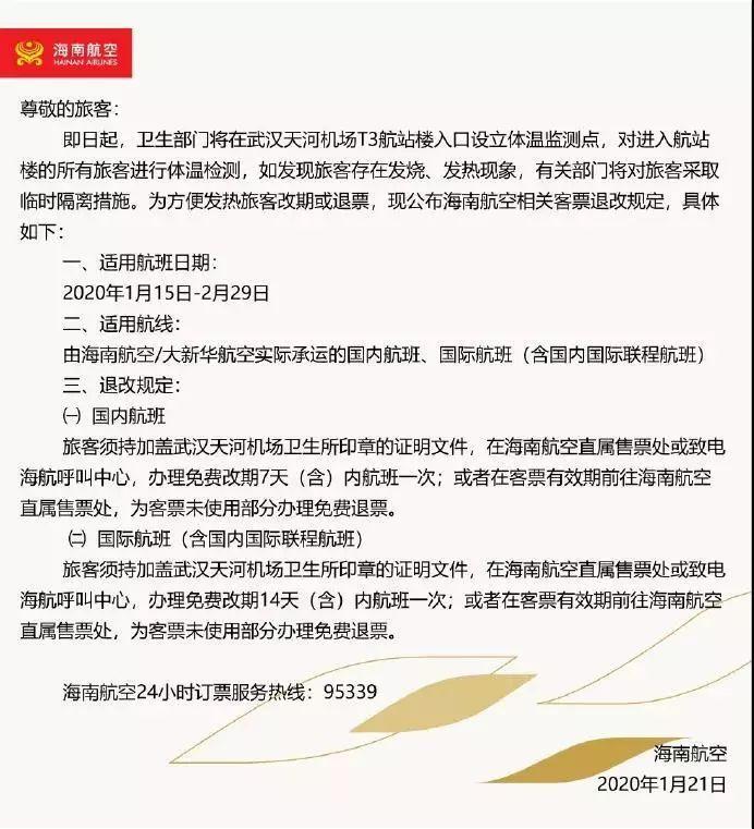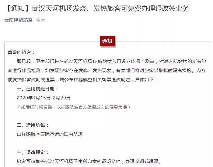 截至21日发稿时,其他航空公司包括吉祥航空、首都航空、天津航空、昆明航空、西部航空、祥鹏航空、金鹏航空、四川航空、多彩贵州航空等多家国内航空公司已经发出通告,针对武汉出港的发热旅客,提供免费退改签服务。