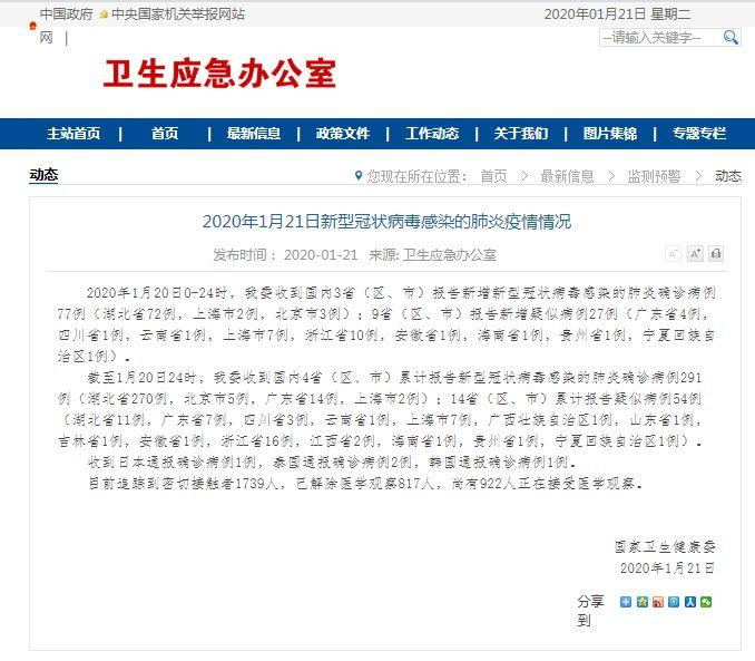 截至1月20日24时,我委收到国内4省(区、市)累计报告新型冠状病毒感染的肺炎确诊病例291例(湖北省270例,北京市5例,广东省14例,上海市2例);14省(区、市)累计报告疑似病例54例(湖北省11例,广东省7例,四川省3例,云南省1例,上海市7例,广西壮族自治区1例,山东省1例,吉林省1例,安徽省1例,浙江省16例,江西省2例,海南省1例,贵州省1例,宁夏回族自治区1例)。