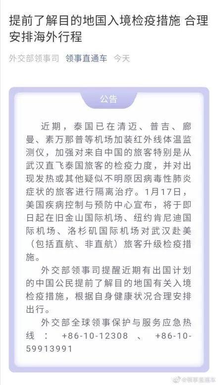 泰国、美国 已开始对来自中国特别是武汉的旅客加强入境检疫。外交部领事司提醒近期有出国计划的中国公民提前了解目的地国入境检疫措施,根据自身状况合理安排行程。