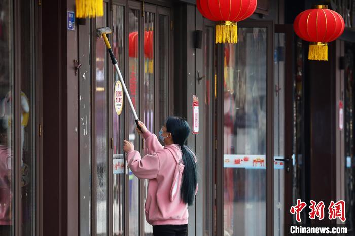 南京夫子庙景区内的商家工作人员打扫店面,准备营业。 泱波 摄
