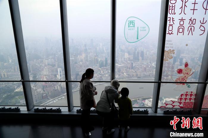 游客在上海中心大厦118层观光厅俯瞰上海全貌。 汤彦俊 摄