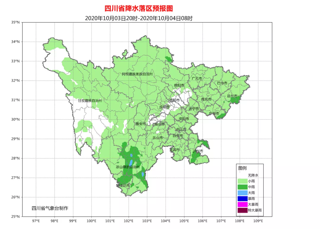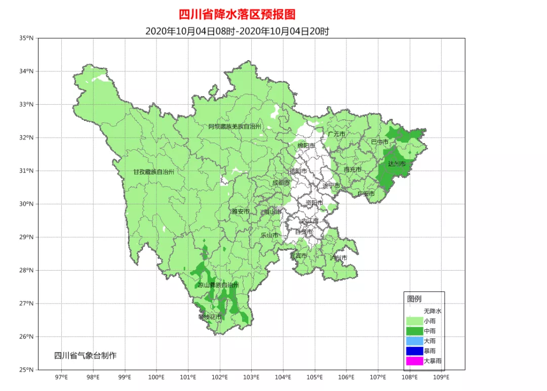 记者从四川省自然资源厅了解到,根据四川气象的消息,今日20时到明日20时,四川盆地大部地方阴天有小雨,其中巴中、达州、广安、泸州4市有中雨,达州局地有大雨,凌晨开始北部将有3~6级偏北风;川西高原多云间阴天有阵雨或雷雨,其中阿坝州北部有中雨;攀西地区阴天间多云有小到中雨,局地有大雨。