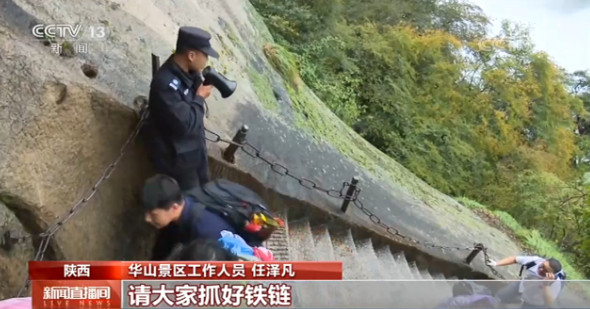 眼前这位小伙叫任泽凡,自假期开始以来,每天都在华山北峰犁沟门等险要地段,用小喇叭反复提醒游客注意登山安全。此外,金锁关位于华山北峰,是游客登顶必经之地,华山景区指挥部针对连日阴雨天气和游客增多的情况及时加派了执勤人员。