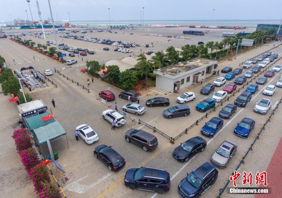 10月7日,“十一”黄金周假期临近尾声,位于海南海口的新海港、秀英港、粤海铁路南港三大港口迎来自驾游车辆返程高峰。图为航拍在海口新海港入口排队安检的车辆。 骆云飞 摄