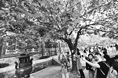 昨天下午,北京青年报记者来到香山公园。由于疫情防控需要,今年公园东门外广场没有摆放立体花坛,减少游客因驻足拍照造成人员聚集。宽阔的广场上增设了验证通道,游客进入公园大门前,需要先过两关。先要经过安检、健康码核验区,游客需要提前打开手机健康宝,验证健康状态;随后进入体温检测区,红外线测温系统对每一位入园游客进行体温检测,无异常后方可进入。进入香山公园,勤政殿前的两株元宝枫已经部分变红,在阳光照射下,鲜红的叶片显得晶莹剔透。这两棵树被喻为香山红叶的“消息树”,也是每年香山赏红的标志性景观。不少游客站在树下,拿出相机拍照留影。