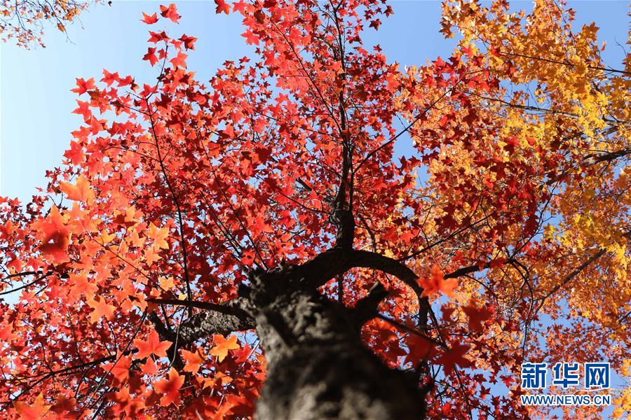 这是10月18日在磬锤峰国家森林公园拍摄的枫叶。 金秋时节,河北承德磬锤峰国家森林公园的枫叶进入观赏佳期,吸引游客前来观赏游玩。 新华社发(刘环宇 摄)