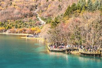 11月8日,游人穿梭在宛如“童话世界”的九寨沟,景区外的漳扎镇上一派热闹景象。历经三年,九寨沟灾后重建基本完成,项目完工率达93.03%。
