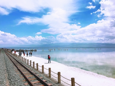 位于青海省乌兰县境内的茶卡盐湖,是一个天然结晶盐湖,为柴达木盆地四大盐湖之一,是青海四大景之一,被旅行者们称为中国版天空之镜。今年4月,茶卡盐湖景区历经6个月的升级改造之后正式开园迎客。图为游客在景区内游玩。斯诺摄/光明图片