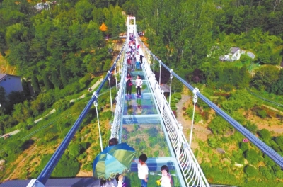 在鸡冠洞景区,八方游客与当地百姓一起踏上幸福桥,共享旅游发展成果