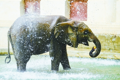 昨天,动物园里的小象“华华”一边淋浴一边吃苹果。