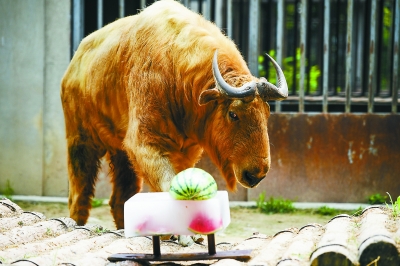 羚牛准备享用饲养员特别送上的冰镇西瓜。