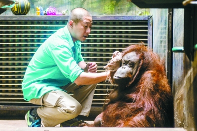 饲养员为上了年纪行动不便的猩猩“胖胖”擦身降温。