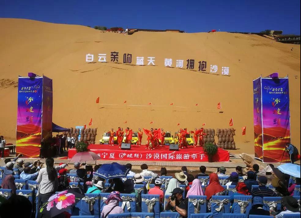 9月7日下午,作为宁夏回族自治区六十周年大庆特别献礼,2018宁夏(沙坡头)国际沙漠旅游牵手活动,在宁夏中卫沙坡头景区启幕。本次活动由宁夏旅游发展委员会、中卫市人民政府主办,中卫市旅游发展委员会承办,新加坡华运旅游有限公司、中卫沙坡头景区、宁夏招商国旅、宁夏铁道国旅、宁夏中国旅行社共同协办。千余名来自新加坡、泰国、马来西亚、印度尼西亚、美国、加拿大、澳大利亚、新西兰、韩国等多个国家和地区的境外游客和国内游客参加此次活动。宁夏知名旅游商品企业百瑞源枸杞股份有限公司赞助活动礼品。