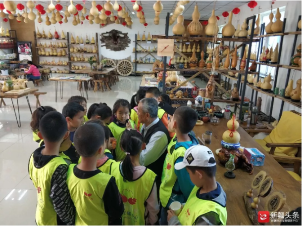 孩子们跟着葫芦雕技艺非遗传承人学习。图 /乡村创客葫芦园