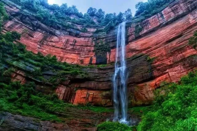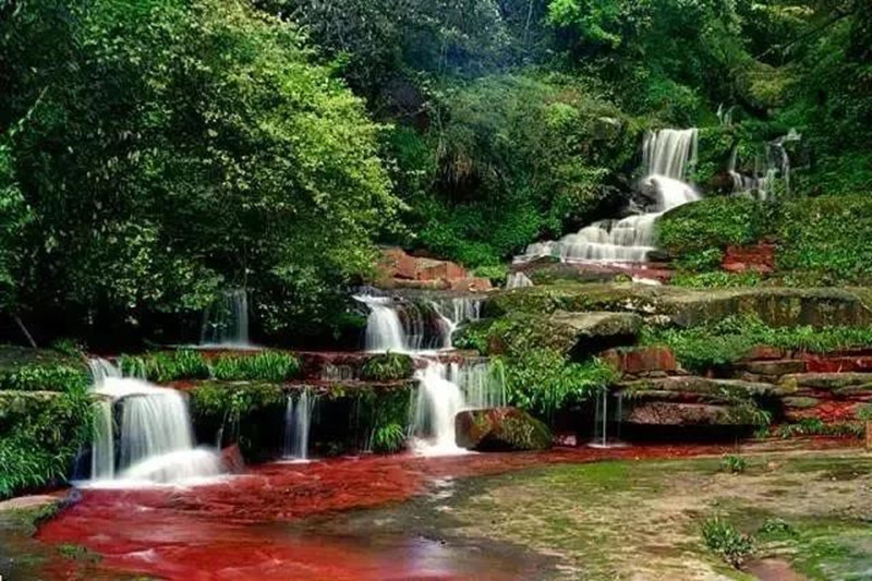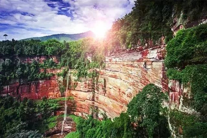 赤水以丹霞地貌著称,被列入世界自然遗产。在艳丽鲜红的丹霞赤壁上往往挂着一、二条瀑布,站在崖壁下的你必定会为之惊叹。