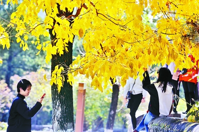 潭柘寺大门外,金黄色的林木让游客流连忘返。虽然不是著名古树,但秋色美景足以让大家乐在其中。