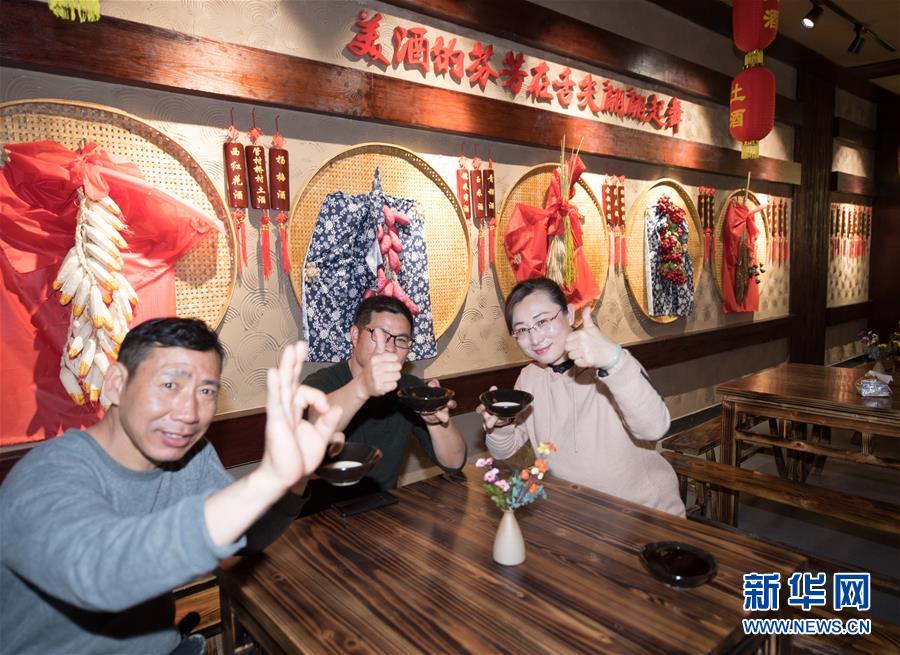 游客在浙江省建德市大同镇管村桥村文化礼堂品尝该村特产土酒(2018年3月13日)。2017年起,建德市对农村文化礼堂建设进行“一村一品”提升改造,打造惠民、育德、展示等为一体的文化礼堂,尝试“乡村文创客厅”建设,促进乡村振兴。新华社记者 翁忻旸 摄