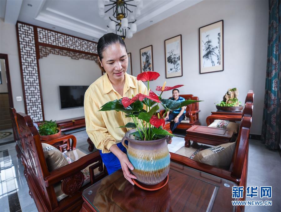 2018年9月26日,东林镇东升村村民施勤英在新居内布置绿色盆栽植物。新华社记者 徐昱 摄