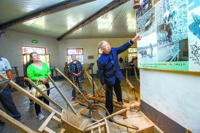 河北村的老人家给到访村史馆的市民讲述以前如何干农活。