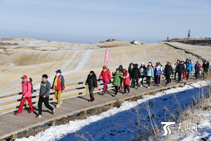 2018年11月11日,徒步爱好者行走在江布拉克景区的木栈道上。
