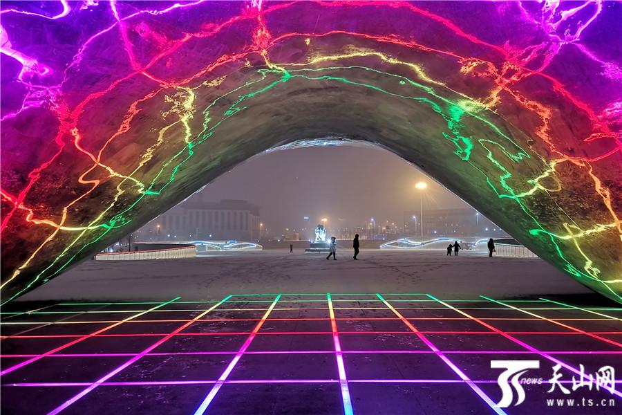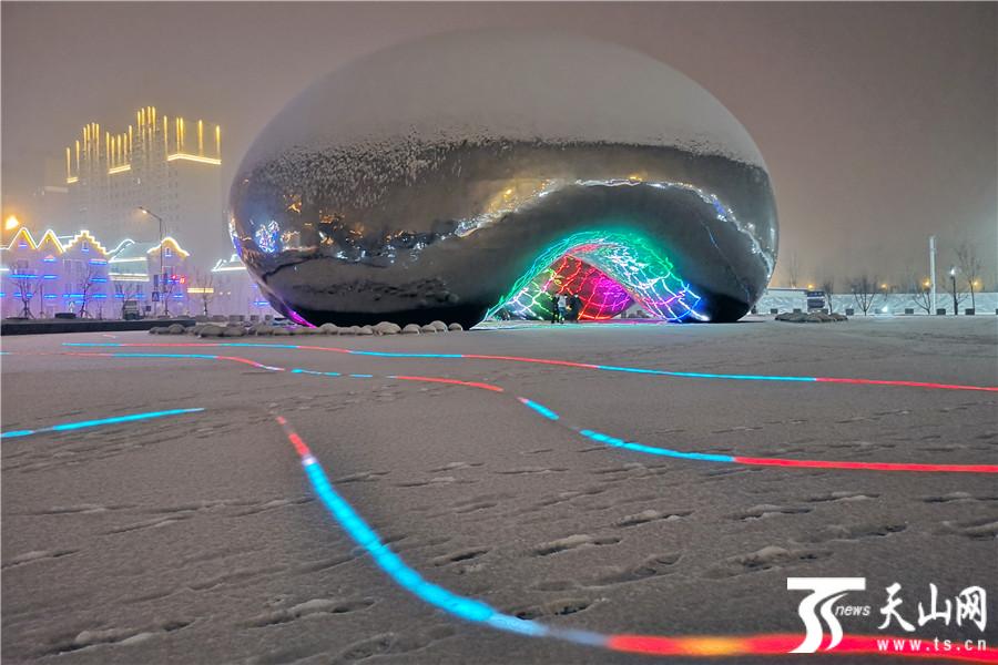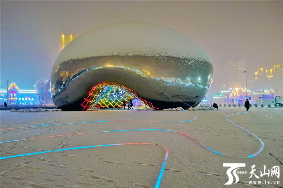 天山网讯(克拉玛依日报记者张珏摄影报道)2018年12月18日晚,新疆克拉玛依市降下大雪,克拉玛依一号井红色旅游景区内,市民们正在赏雪游玩。当天,景区内的油泡雕塑群的顶部都被积雪覆盖,仿佛一簇簇刚刚破土的蘑菇。大油泡内部绚烂多变的灯光效果在寂静白雪的映衬下,显得格外梦幻动感,为寒冷的冬夜增添了不少浪漫氛围。