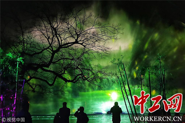 2019年1月8日晚,江苏无锡灵山小镇拈花湾,五彩斑斓的水幕电影令游客陶醉其中。灵山小镇拈花湾靠山面湖,与驰名中外的灵山大佛依山为邻,游客行走其间,可体验无处不在的禅意生活,感受“一花一世界”的宁静与美好。