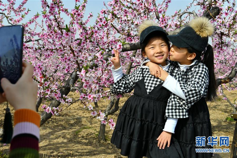 3月26日,两位小游客在运城市陶村镇辛曹村桃花岭桃林中合影。 随着气温升高,山西省运城市陶村镇辛曹村桃花岭桃花绽放,吸引了不少游客前来观赏。 新华社记者曹阳摄