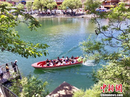 澄澈的河水映衬青山绿树蓝天白云,游船荡漾水面,十分惬意。 钟欣 摄